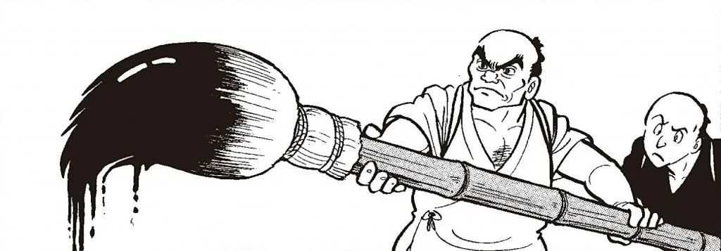 Hokusai se preparando para fazer um de seus desenhos gigantes no mangá de Ishinomori