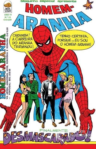 Entre 1975 e 1979, o Homem-Aranha foi publicado no Brasil pela Bloch Infanto Juvenil, braço da Bloch Editores, por sua vez parte do poderoso conglomerado de mídia Grupo Bloch, que envolvia concessões de rádio, TV e publicações diversas, como as famosas revistas Manchete e Ele & Ela. O gibi do amigão da vizinhança durou 33 edições e – embora tenha feito bastante sucesso – para mim será sempre lembrado como um dos momentos mais surreais das HQs no Brasil. Erros de revisão, traduções malucas e escolhas editoriais equivocadas resultaram numa receita indigesta que até hoje provoca arrepios em quem opta por (re)ler o material. A editora também publicou outros títulos da Marvel e de outras grandes norte-americanas, mantendo um padrão de qualidade – no mínimo – questionável. Por razões de falta de tempo, optei por falar apenas das edições do Homem-Aranha a que tive acesso. Não foi uma experiência agradável. Para que tenham ideia do que estou falando, cheguei a sentir saudade do formatinho da Abril.
