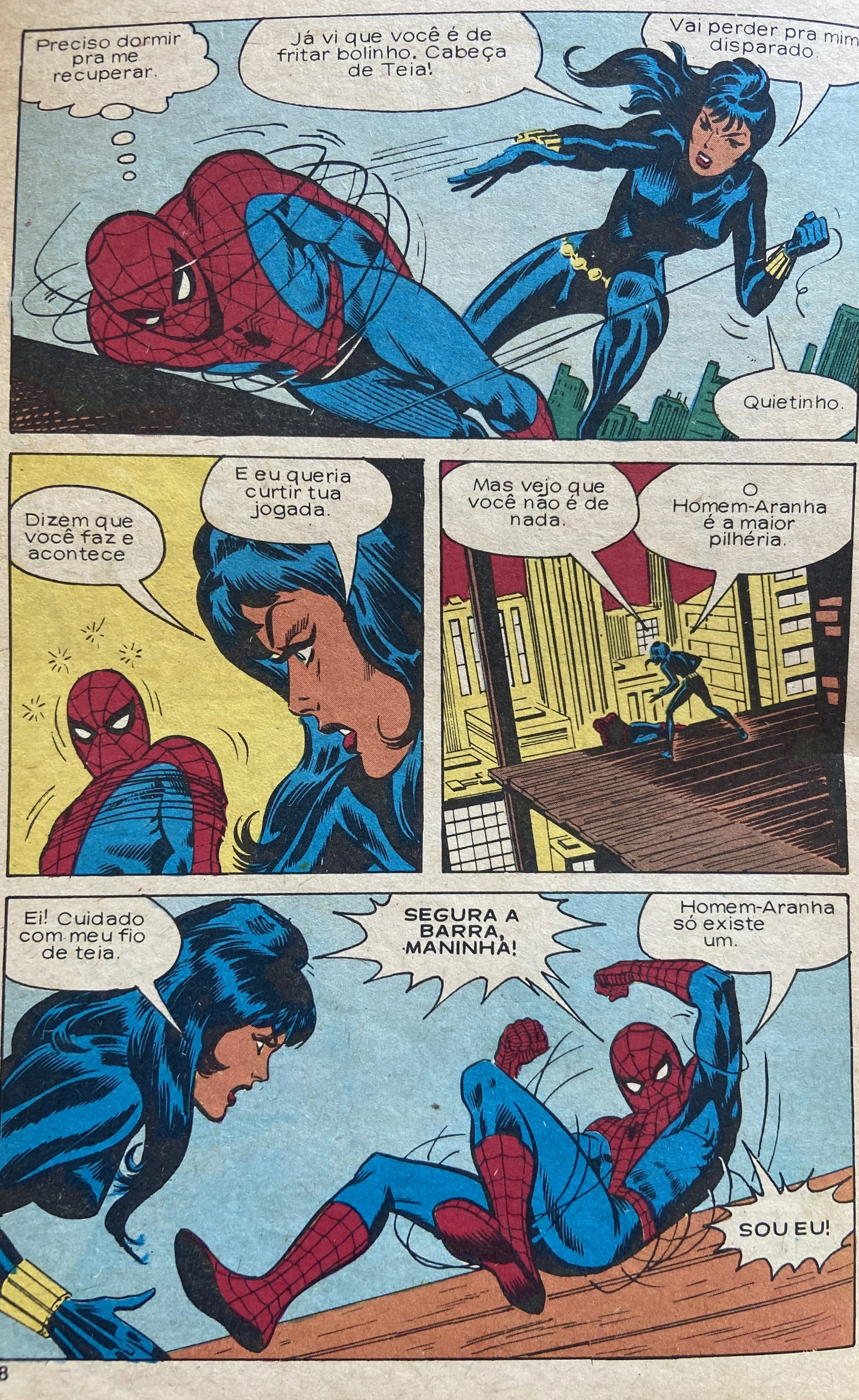 Jamais na história da tradução dos quadrinhos mundiais uma página conseguiu chegar aos pés da que veremos abaixo – publicada na edição 33 de Homem-Aranha –, merecedora de emolduramento. Coincidência ou não, foi o último número da revista. Talvez já sabedores do final irreversível do gibi, os tradutores tenham botado pra quebrar, celebrando um canto de cisne temperado com a maior quantidade possível de deboche e escárnio. No duelo entre Aranha e Viúva Negra, a recém convertida heroína chega mandando um: “Já vi que você é de fritar bolinho, Cabeça de Teia!”. Não satisfeita, emenda com: “Dizem que você faz e acontece. Eu queria curtir a tua jogada”. O fechamento não poderia ser mais sensacional: “O Homem-Aranha é a maior pilhéria!”. Para não ficar por baixo, nosso herói responde com: “Segura a barra, maninha!”. Difícil imaginar diálogo mais memorável em toda a trajetória da Marvel e DC no Brasil. Se não tivesse a revista em questão, também duvidaria que isso aconteceu, mas segue a prova do crime.