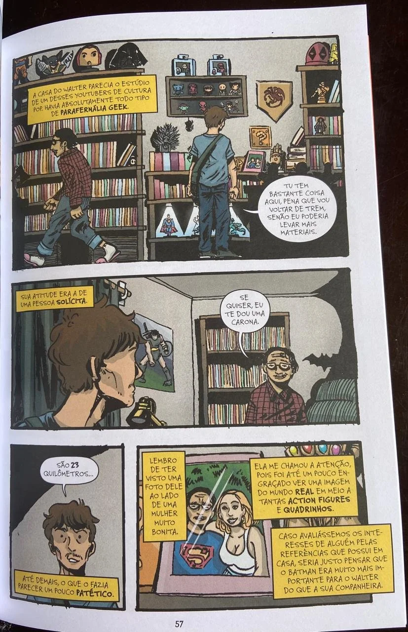 A principal reflexão de O Colecionador é sobre o contraste entre as vidas não vividas colecionando com as vidas que se resgatam a partir da morte dos colecionadores. Sim, os autores carregam nas tintas melodramáticas (especialmente no final um tanto decepcionante) e Érico parece meio “nutella” com seu fastio incessante diante de tudo e todos. Porém, quando ele se embrenha numa jornada para compreender a quem pertenceram os itens de sua coleção e também aqueles que ele vai vender em seu sebo, subitamente a HQ ganha um propósito e atinge a dimensão existencialista que sugere o tempo todo, com acertos irregulares.