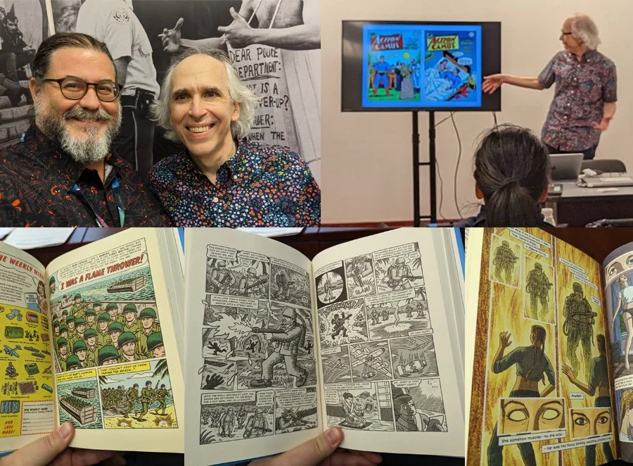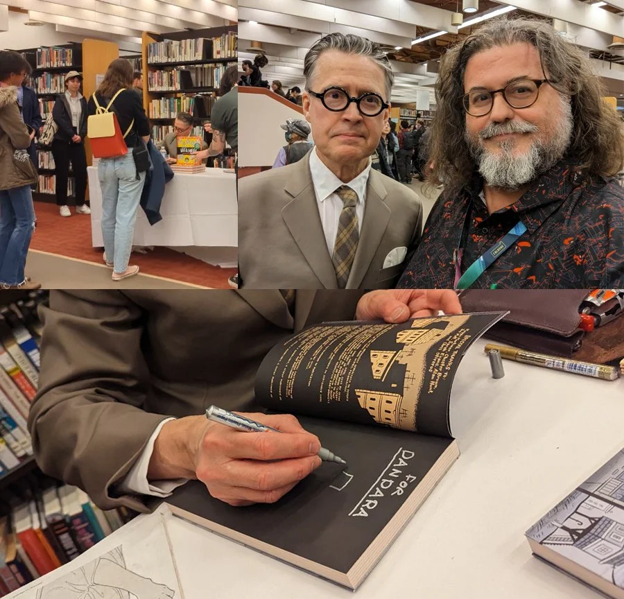 Outra conversa ótima foi a que tive com o cartunista R. Sikoryak, conhecido por suas provocantes e inteligentes paródias em quadrinhos, como Terms and Conditions, uma adaptação não-autorizada do contrato de usuário do iTunes, com 100 páginas desenhadas cada uma no estilo de uma tira ou quadrinista conhecidos. Após apresentar a palestra “Remixing the past, present, and future of comics”, sobre seu processo de trabalho, gentilmente aceitou sentar comigo para que eu pudesse entrevistá-lo para meu doutorado sobre a forma que utiliza a tipografia e demais elementos gráficos das capas de revistas antigas como apoio para a construção de suas mensagens. De quebra, me mostrou as então inéditas HQs que fez para o livro The Making of Another Major Motion Picture Masterpiece, de Tom Hanks, que seria lançado na semana seguinte. O romance conta os bastidores da produção fictícia de um filme de Super-Herói, baseado em um personagem de quadrinhos underground dos anos 1970 inspirado por uma HQ de guerra de 1947. As três HQs — tem também uma espécie de quadrinização do filme — em estilos distintos foram feitas por Sikoryak.