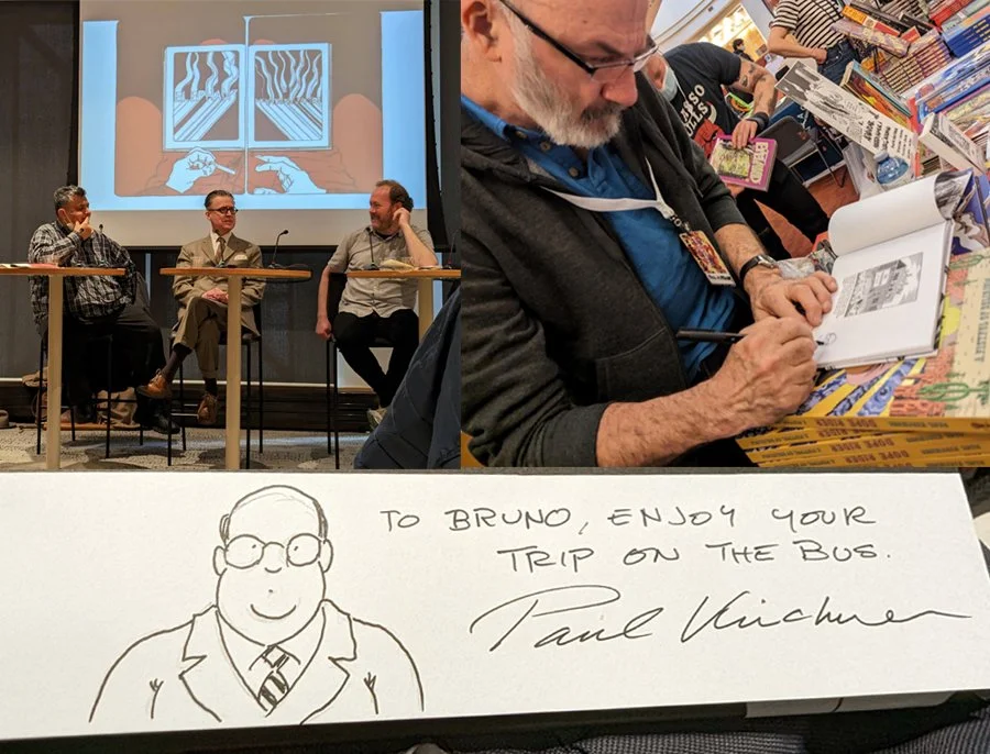 Um belo encontro inesperado — porque não havia lido seu nome no mapa das mesas — foi com o estadunidense Paul Kirchner, autor de The Bus, tira surrealista publicada na revista Heavy Metal entre 1978-1985 (e publicada anos passado no Brasil como Ônibus pela Risco Editora, com tradução de Érico Assis). Simpaticíssimo, batemos um longo papo enquanto ele cuidadosamente autografava os dois volumes de The Bus que comprei. Em meio a falarmos sobre diferentes tipos de festivais de quadrinhos e os públicos que os frequentam, ele contou que vendera quase todas as artes da tira de uma vez só nos anos 1990, e como a obra foi redescoberta.