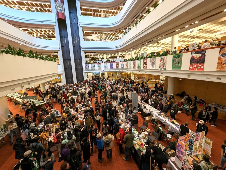 O TCAF - Toronto Comic Arts Festival 2023, que aconteceu entre 28 e 30 de abril, comemora exatas duas décadas desde a realização da sua primeira edição, em 2003. Acontecendo inicialmente a cada dois anos, o festival tornou-se um evento anual a partir de 2009, quando passou a ocupar o fantástico prédio da Toronto Reference Library, a maior e mais visitada unidade do sistema municipal de bibliotecas públicas, localizada em um dos pontos mais centrais da cidade. O objetivo do festival é promover as histórias em quadrinhos para o grande público, focando a diversidade de vozes de seus autores. Pelo que pude observar este ano, o TCAF tem sido muito bem sucedido neste sentido. Desde 2016, o evento atrai por volta de 25.000 visitantes nos dois dias — um fim-de-semana — em que acontece.