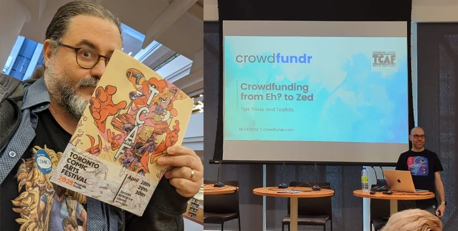 O programa do TCAF 2023 e David Barach dismistifcando o financiamento coletivo de quadrinhos no Canadá.