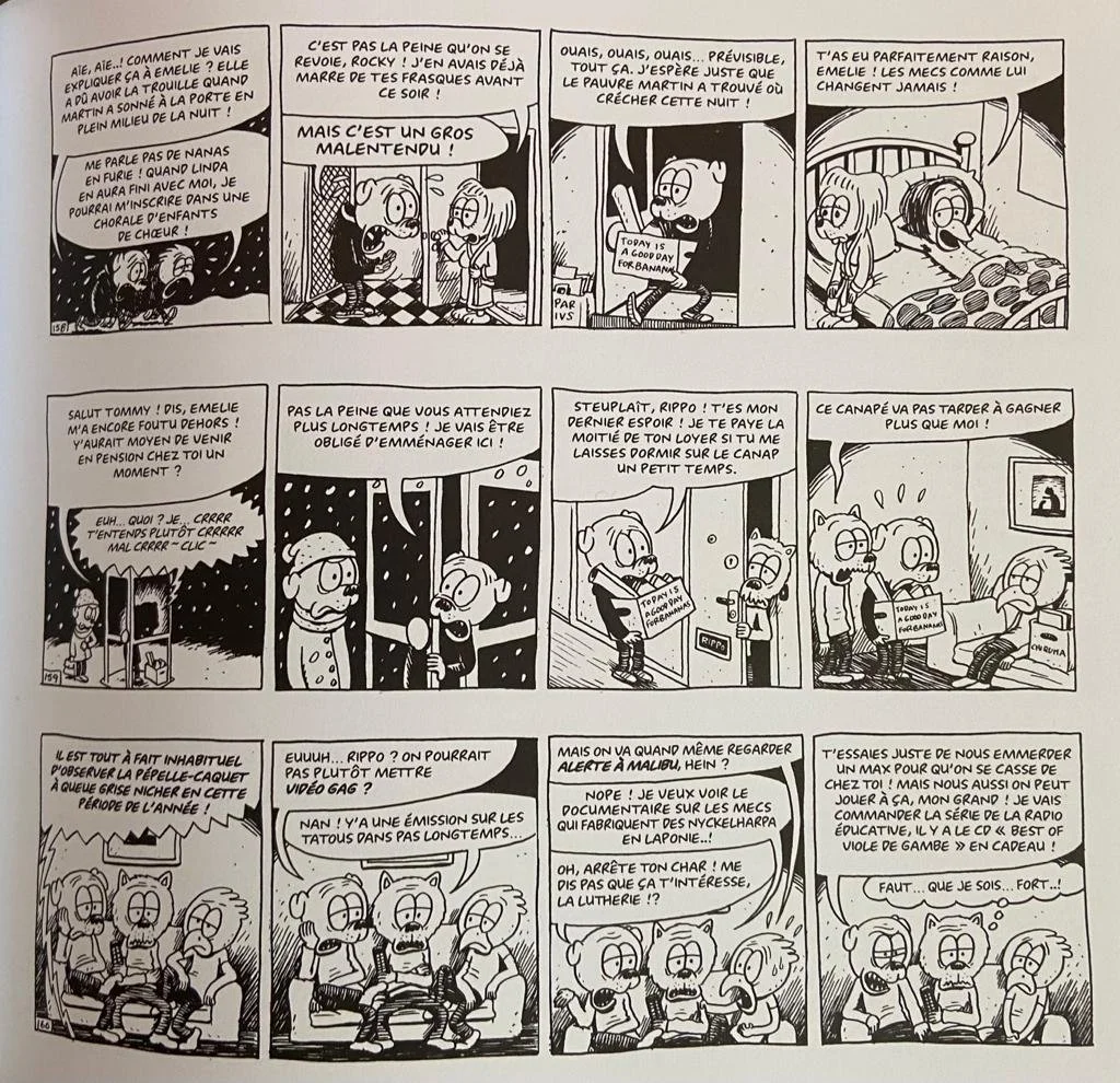 Rocky Vol. 1 – Martin Kellerman (Huber, 2016. Traduzido para o francês por Aude Pasquier): Às vezes pode ser que esqueçamos o quanto os quadrinhos podem ser contagiantes explorando apenas a simplicidade de suas formas básicas, de seu narrar contínuo e eterno, especialmente quando isso se dá na forma de tiras. É o caso de Rocky, um hit dos quadrinhos suecos publicado desde o final dos anos 1990 que galgou popularidade no famoso e internacional jornal Metro. Aqui há pouca linguagem, e ação minimalizada: basicamente acompanhamos o jovem protagonista que dá título à tira, junto a uma claque de amigos idiossincráticos, em desventuras afetivo-sexuais (além de problemas de grana, saúde, família) por uma gélida Estocolmo carregada das peculiaridades urbanas e sociais de um dos países mais desenvolvidos do mundo. Muitos balões de fala mordazes, fortemente politicamente incorretos para os padrões de hoje, destilando aquela acidez insuperável de certo humor nórdico. Não me surpreenderia se o polêmico Martin Kellerman fosse a inspiração para o cartunista (que igualmente se inspira em Fritz The Cat) feladaputa do filme norueguês (de Joachim Trier) A Pior Pessoa do Mundo. A edição francesa da Huber, por mais que tenha um capa hedionda e que não faz jus ao conteúdo maneiro do gibi, abarca vários anos da série. Um bom desafio para as editoras brasileiras publicarem algo diferente. Mais sobre esse quadrinho AQUI. (CIM)