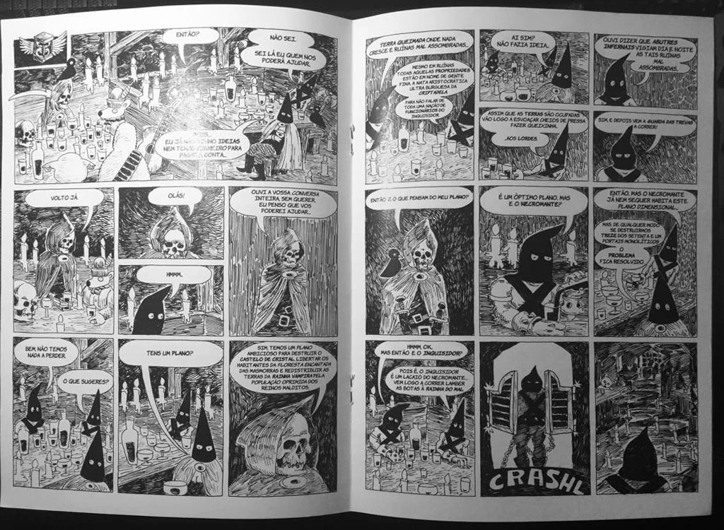 Non Serviam - Rodolfo Mariano (Bedeteca de Beja, 2022): Outorgado anualmente pelo Festival Internacional de Banda Desenhada de Beja, o Prêmio Geraldes Lino garante ao quadrinista que o recebe não apenas um troféu e uma exposição no evento mas também uma HQ publicada em um número da Coleção Toupeira, existente desde a primeira edição do evento, em 2005. O vencedor de 2022 foi o coimbrense Rodolfo Mariano, que conversou conosco aqui sobre sua HQ digital Cloak and Dagger. Lançada no Festival, Non Serviam possui uma célere e lúgubre arte em preto e branco, bem adequada para esta bem humorada crônica sobre as relações trabalhistas no Reino de Cemitéria, uma espécie de terra de contos de fada medieval com feiticeiros, ogros e espíritos do mal. Narrada por uma caveira, a trama se passa em uma taverna, onde descontentes carcereiros discutem seus infortúnios — acúmulo de funções, redução de salários, emprego de mão de obra descartável (no caso, esqueletos) — e começam a costurar uma improvável aliança com os bichinhos fofinhos da Floresta Mágica para uma greve… ou revolução. Diversão despretensiosa com consciência de classe. (BP)