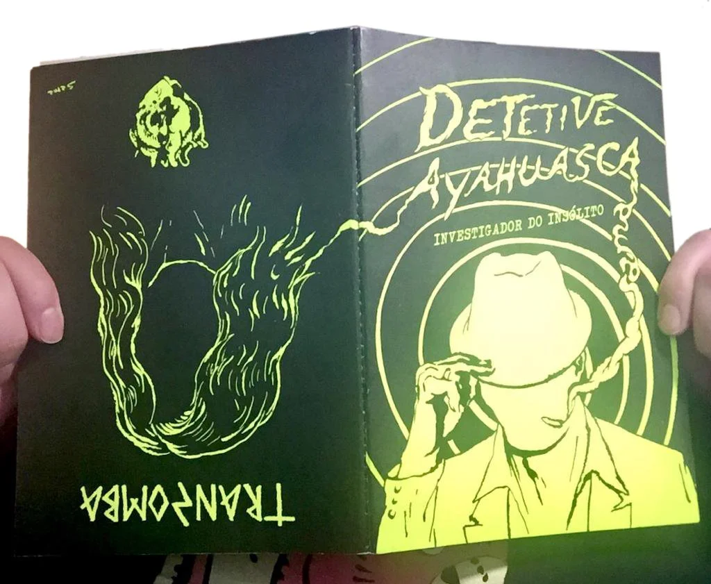 Detetive Ayahuasca, Investigador do Insólito & Tranzomba - Sama (Independente, 2022): Tony Jagube é o seu típico detetive particular pulp, mas que exerce sua profissão tomando ayahuasca, bebida que altera a consciência e o induz ao estado xamânico, permitindo que se comunique com o mundo dos mortos. Ao investigar a violenta morte do filho do governador, descobre que a vítima e seus amigos costumavam assassinar travestis — o que nos leva à outra HQ da publicação, Tranzomba, cuja leitura se dá a partir da quarta capa invertida. Essa conexão física das duas HQs independentes — que não as dispõe em sequência, mas em consequência — dada ao suporte de leitura é um grande achado do autor, que simultaneamente concede uma espécie de final feliz à protagonista de Tranzomba, bem como a revelação do mistério investigado por Jagube. (BP)