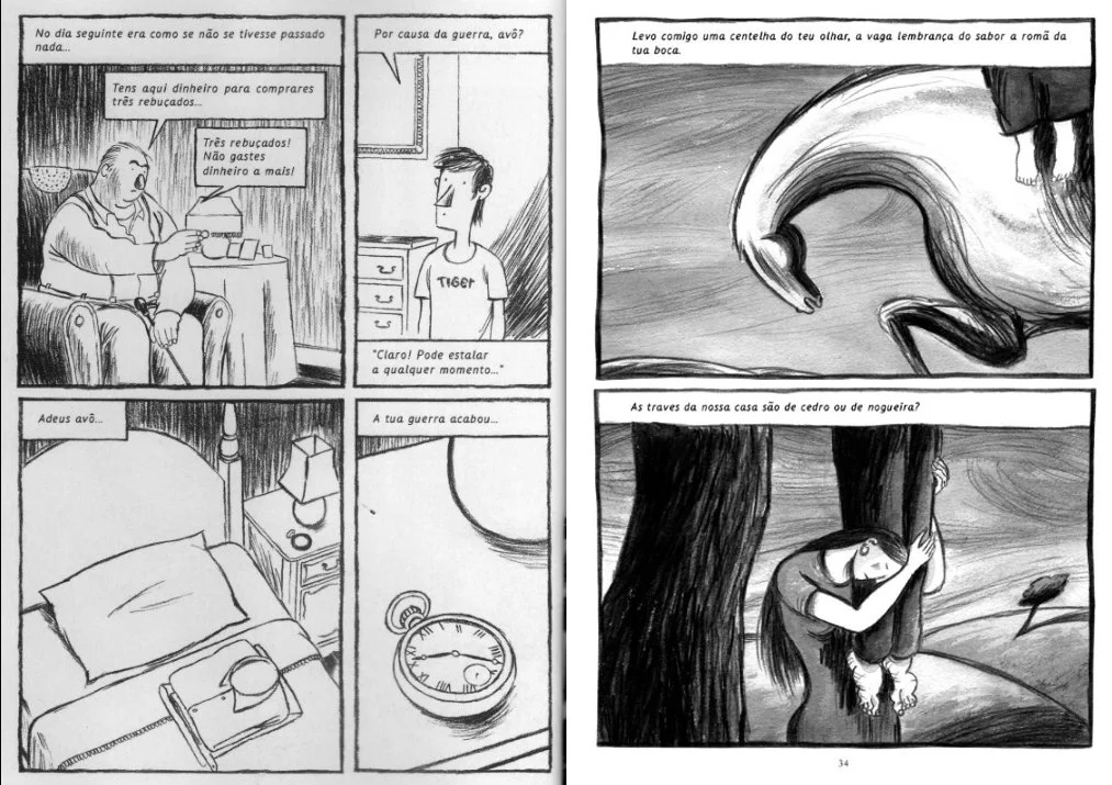 O Amor Infinito Que te Tenho e Outras Histórias (4ª edição) - Paulo Monteiro (Polvo, 2021): Lançado originalmente em 2010 e agraciado com o Prix Sheriff D'Or 2013, o livro reúne uma dezena de HQs curtas do autor português Paulo Monteiro, mais conhecido por nós brasileiros por estar a frente do Festival Internacional de Banda Desenhada de Beja — sobre o qual conversou conosco aqui . Monteiro tece delicadas narrativas ilustradas em primeira pessoa, sempre de forma intimista embora alterne aspectos interiores e externos nas reflexões de seus personagens. Na excelente “A tua guerra acabou” (a única que recebe balões de diálogo além de recordatórios), aborda as memórias que um menino tem de seu avô, a partir da pequena herança que recebe quando este morre. Já na reflexiva “Para lá dos montes”, o protagonista descreve sua relação com o que o cerca, partindo de seu próprio corpo e chegando até as fronteiras da cidade que o poderiam levar a outras terras. Hábil em encontrar representações para sentimentos como angústia, encanto, saudades ou orgulho, seu desenho em preto e branco é versátil, adotando a dramaticidade (“Os teus róseos lábios”) ou a leveza (“Irei ver a amada”) que ache necessária. (BP)